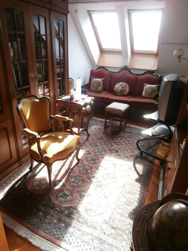 Budapest II. kerületi Rózsadombon, exkluzív, zöldövezeti környezetben eladó egy közvetlen kertkapcsolatos, nagy teraszos, nappali és három hálószobás, háromszintes 160 m2-es, jó állapotú társasházi öröklakás.